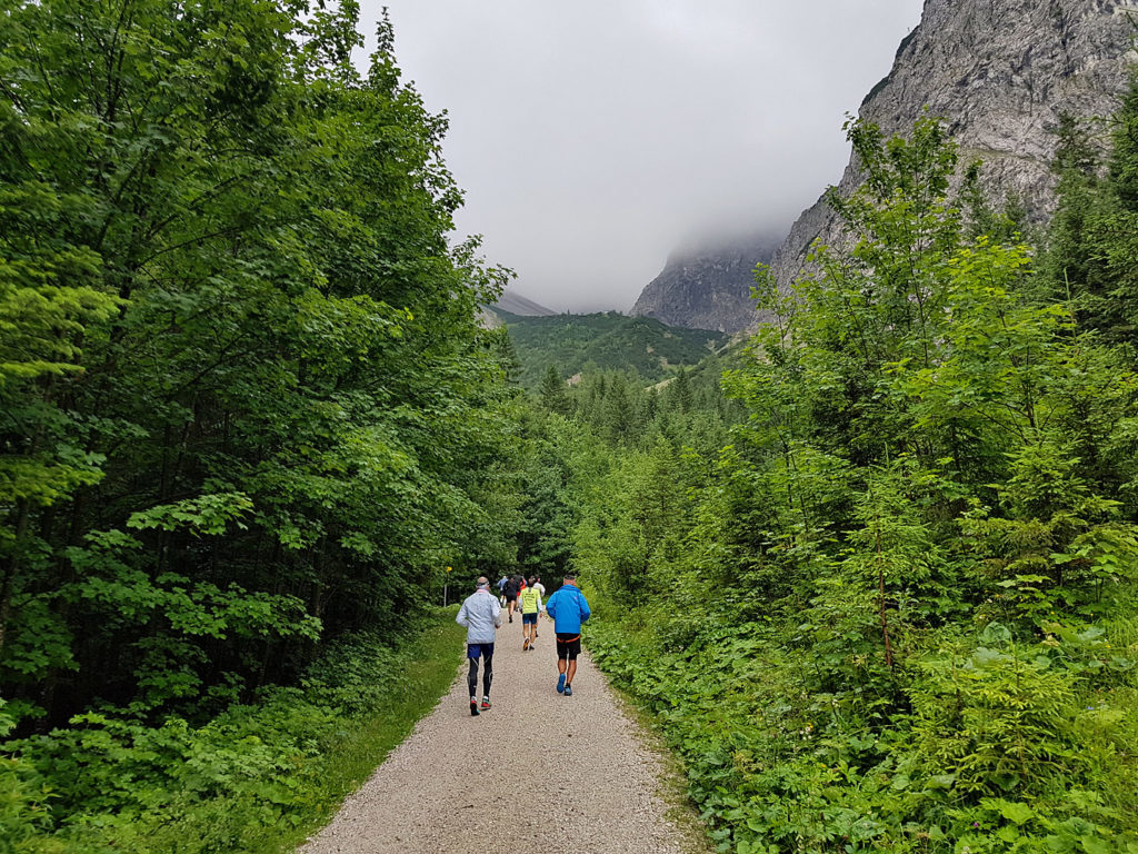 A quick drive down the Leutasch valley brought me to Mittenwald, the starting point of the race. I parked, paid for that privilege and proceeded on foot to the middle of the city. I was glad that I brought my umbrella for the sign-up. It was still raining quite heavily. Over the microphone, the race director was warning runners that it was really cold up high, and that people shouldn’t just start in shorts and a singlet. Also, it was announced that the finish line had been moved down – instead of ending at the Nördliche Linderspitze at 2374m, about 1.5km and 150m of elevation were shaved off so that runners could arrive in relative warmth and safety just next to the cable car station instead of an exposed mountain peak.