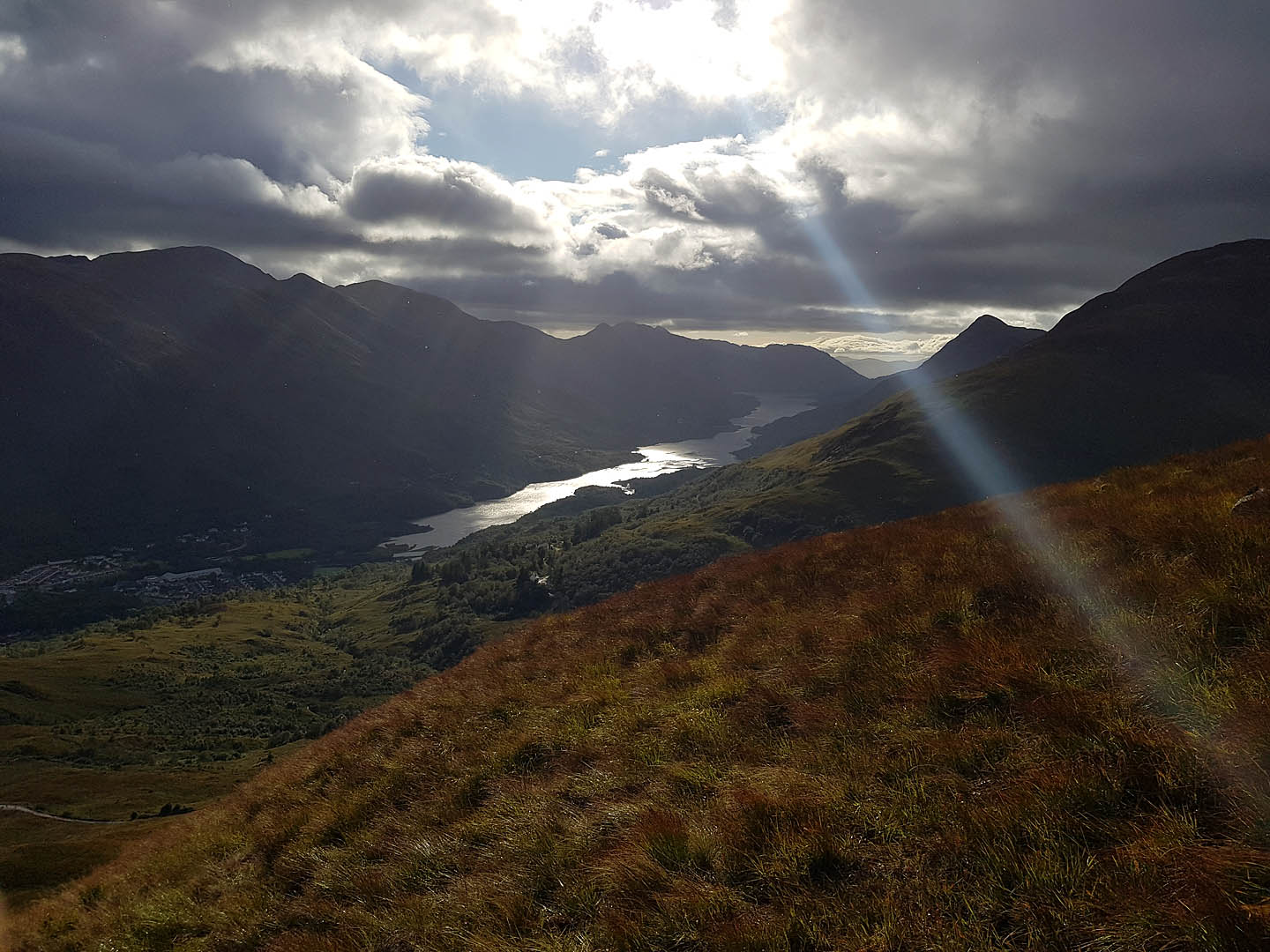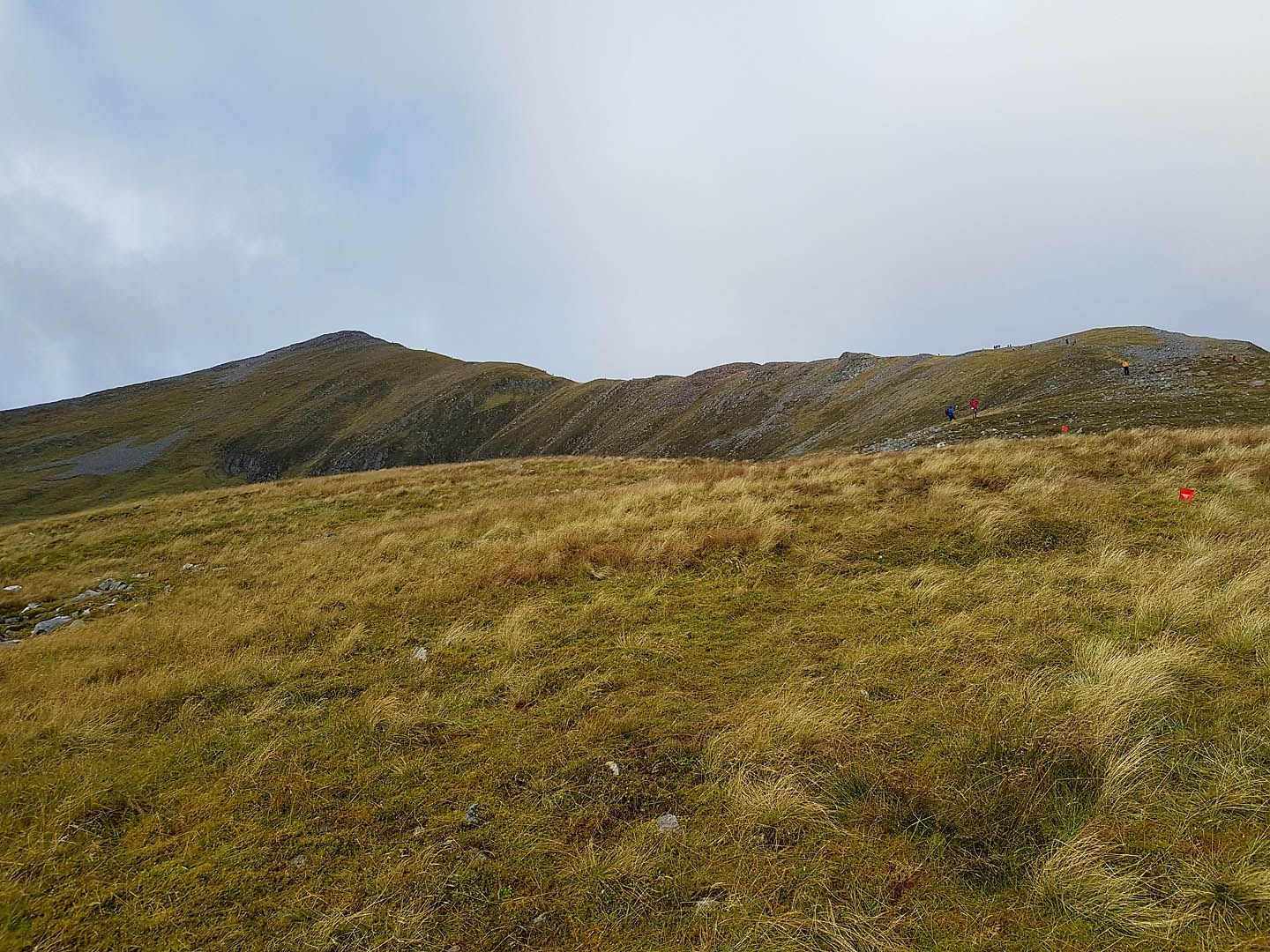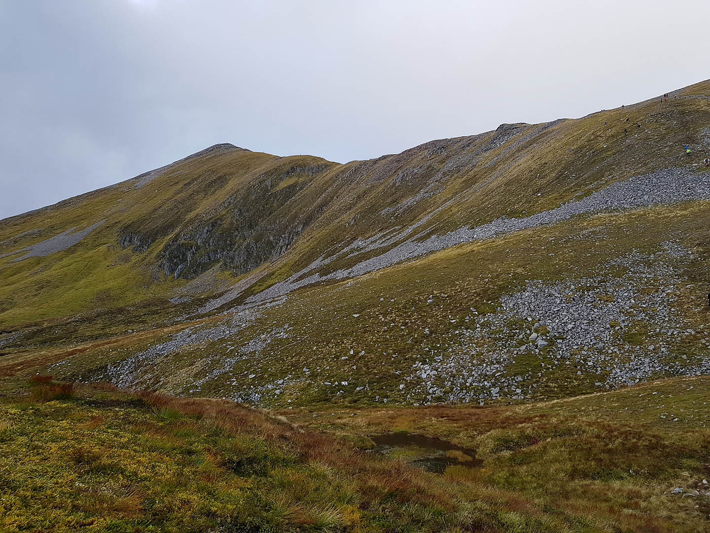 I wore a technical shoirt-sleeved Under Armour t-shirt, my Ronhill 2-in-1 shorts, calf-length compression socks and Salomon Speedcross 3 shoes with about 280km on them already. In my backpack (Salomon Adv Skin 5), I was carrying the mandatory protection layers (waterproof pants and rain jacket) and 0.5 liters of water in a soft flask. Also pictured is a grey-coloured second layer which I’m not sure I actually carried in then end. Not pictured are gloves, a buff and a beanie; which I all wore at higher elevations.The starting line in Kinlochleven, next to the “Ice Factor” indoor ice climbing hall.Emelie Forsberg started just a few people (and minutes) ahead of me. Obviously, I didn’t catch her.1km done, already 132m up. Up to here, the surface is mostly gravel. From here on out, it got a lot muddier.The route is sign-posted really well; even in spots where it’s not really necessary. Here, the biggest decision is in selecting the rut that has the least amount of mud.This was probably the nastiest puddle. Looks are deceiving, I went in almost up to my knees. I saw another competitor actually trip and fall in with his whole body. (I took this picture on the way down.)Here, the elevation gain is slightly more moderate. A decent runner can actually run this. I tried and mostly succeeded; but of course the pace is still not very fast.2km and 220m of elevation done. km2 took me 9:06. I had an average HR of 178 on this bit, which is higher than I can usually manage.It’s definitely worth it to look behind yourself, especially if the sun is peeking out between the clouds and there’s scenery like this.By km3 (which took me 16:15), the real climb had started. 447m of elevation covered, which meant that over the course of the next 2km we’d still need to cover over half of the vertical kilometer. We’d left the easy trails and were now on a path-less “bog” – basically, you go up a soggy hill the quickest way possible: straight up.Again, it pays to look further than just your own feet. Taking the camera out probably cost me a little time and some effort, but it was definitely worth it.A look back down. Top right is the start in Kinlochleven, in the middle is the short 50m stretch of gravel road at 330m elevation gain that marks the start of the real climb.The route up is the way down. Depending on your start time (it’s a staggered time trial start spread out over several hours) you’ll encounter people already coming down. Unlike most VK races in the Alps, there’s no cable car to shuttle yourself back down.Eventually, the going gets slightly less steep, but rockier. The route is at the very right.4km done, 862m up. 25:21 to cover a kilometer seems much, but it also climbed 390m. After an endless amount of climbing up a slope that seemed almost vertical, I finally arrived at the ridge. The top is still all the way up.And I’ve arrived. It seems that I did not take any pictures during the final kilometer.Looking EastQuite a bit of interest in the top runners.A look at the rockier part of the final meters. Here, the going is quite technical.Wet bog, steep descent. I only fell on my behind about four times. I think this is where I regret that I took shoes that already had 280km of thread wear.Shoes and socks are a little worse for the wear.At the finish line. 14 seconds faster than the year before.